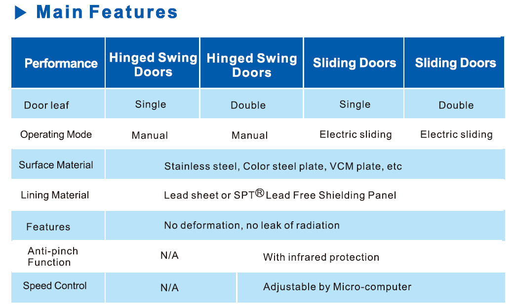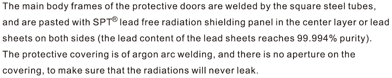 The radiation protective doors can be widely used for radiation protection in CT, Fluoroscopic, DSA, DR rooms etc. in the hospitals.It also sets include Hinged Doors, Sliding Doors and Powered Doors.