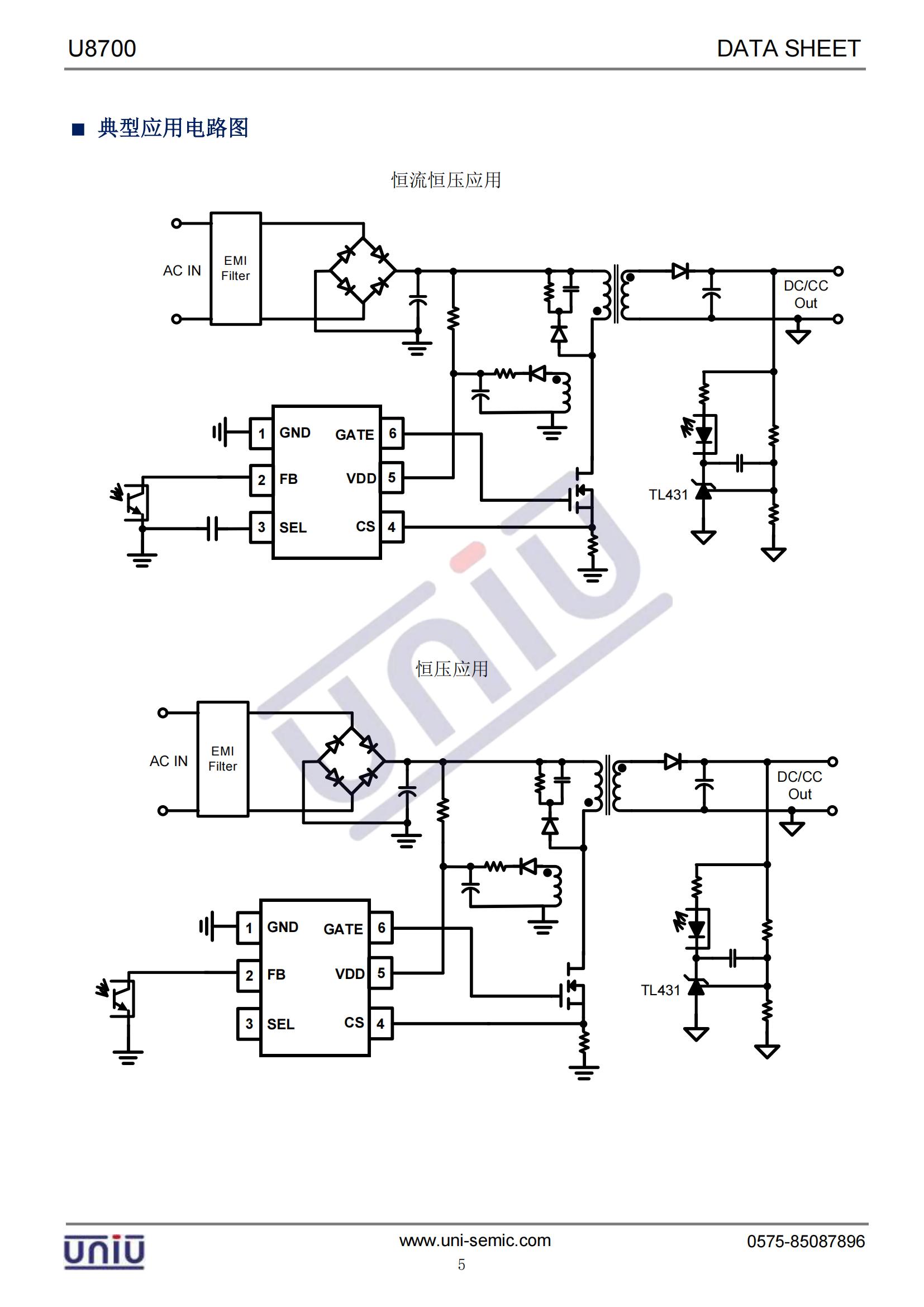 U8700是一款針對離線式反激電源設計的高性能功率開關。U8700內部具有高精度65kHz開關頻率振蕩器,且帶有抖頻功能可優化EMI性能。芯片采用綠色節能模式和打嗝模式工作,可以保證小于75mW的待機功耗。U8700集成有完備的保護功能,包括:VDD欠壓保護(UVLO)、VDD過壓保護(OVP)、逐周期電流限制、短路保護(SCP)、過載保護(OLP)、過熱保護、軟啟動、VDD箝位和CS管腳開路保護等。