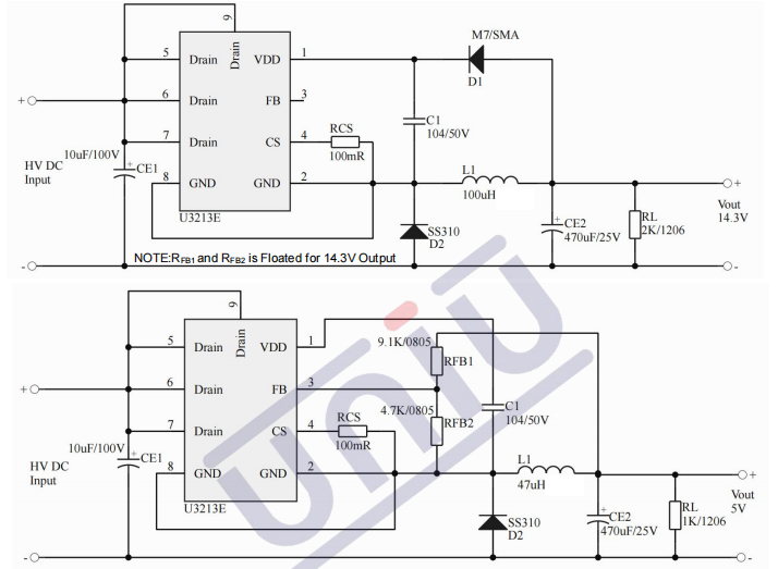 •產(chǎn)品描述:U3213E是一款高性能低成本PWM控制功率器,適用于離線式小功率降壓型應(yīng)用場合,外圍電路簡單、器件個數(shù)少。同時產(chǎn)品啟動模塊內(nèi)置高耐壓MOSFET可提高系統(tǒng)浪涌耐受能力。與傳統(tǒng)的PWM功率開關(guān)不同,U3213E內(nèi)部無固定時鐘驅(qū)動MOSFET,系統(tǒng)開關(guān)頻率隨負(fù)載變化可實現(xiàn)自動調(diào)節(jié)。同時芯片采用了多模式PWM控制技術(shù),有效簡化了外圍電路設(shè)計,提升線性調(diào)整率和負(fù)載調(diào)整率并消除系統(tǒng)工作中的可聞噪音。此外,芯片內(nèi)部峰值電流檢測閾值可跟隨實際負(fù)載情況自動調(diào)節(jié),可以有效降低空載情況下的待機(jī)功耗。U3213E集成有完備的帶自恢復(fù)功能的保護(hù)功能:VDD欠壓保護(hù)、逐周期電流限制、輸出過壓保護(hù)、過熱保護(hù)、過載保護(hù)和VDD過壓保護(hù)等。