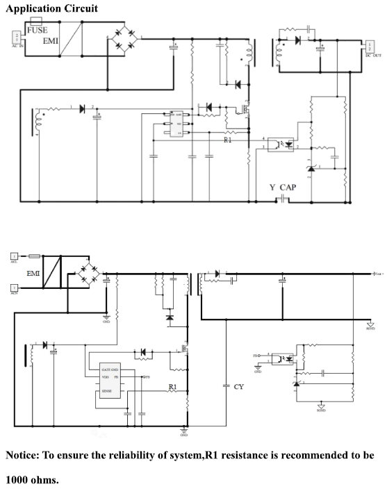 •主要特點:數字頻率變換技術,提高EMI性能。電流感測輸入的前緣消隱。斜率補償。突發模式控制,提高效率,優化待機功耗。啟動電流小,運行電流小。柵極輸出電壓箝位。軟啟動,以減少MOSFET應力在上電期間。綜合保護功能:1、VDD2欠壓鎖滯(UVLO), vdd3過壓保護(OVP),周期電流限制,4、限流補償,在通用交流線路輸入時獲得相同的輸出電流,5、過載保護(OLP), 6、過溫保護(OTP)。300mA驅動能力。