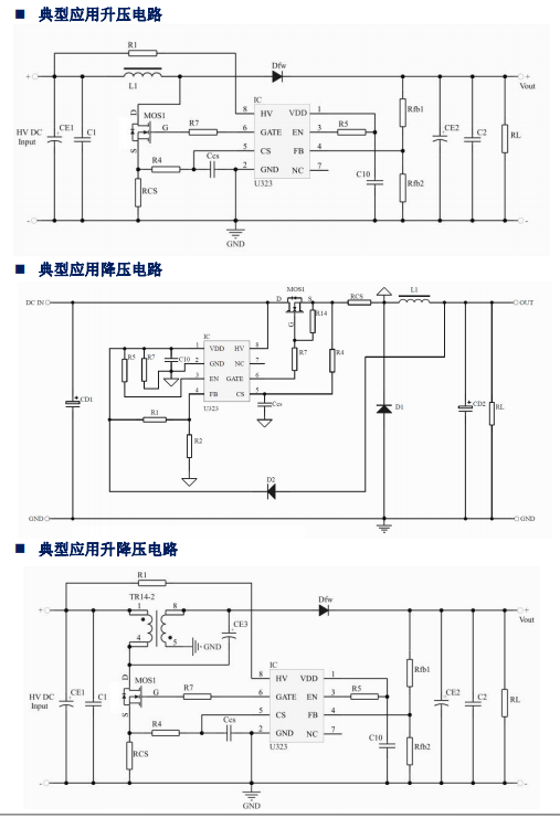主要特點:集成200V高壓啟動電路;使用范圍:VIN-VOUT>3V,Io<15A;BUCK&BOOST兼容;低功耗模式工作;支持升壓、降壓和升降壓拓撲;待機功耗低于50mW;良好的線性調整率和負載調整率;集成軟啟動電路;內部保護功能:過載保護(OLP)、逐周期電流限制(OCP)、輸出過壓保護(OVP)、VDD過壓、欠壓和電壓箝位保護