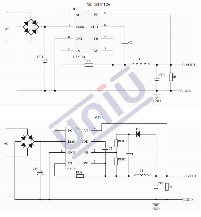 主要特點:集成9Ω,500V MOS ; 集成500V 高壓啟動電路 ; 集成續流二極管 ; 多模式控制、無異音工作 ; 支持降壓和升降壓拓撲 ; 默認12V 輸出( FB 腳懸空) ; 待機功耗低于50mW ; 良好的線性調整率和負載調整率 ; 集成軟啟動電路 ; 內部保護功能過載保護 (OLP) 、 逐周期電流限制 (OCP) 、 輸出過壓保護 (OVP) 、 VDD 過壓、欠壓和電壓箝位保護