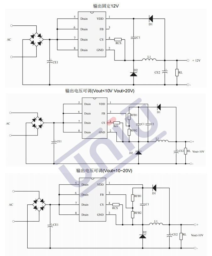 •主要特點(diǎn):集成 650V 高壓?jiǎn)?dòng)電路;多模式控制、無(wú)異音工作;支持降壓和升降壓拓?fù)?默認(rèn) 12V 輸出( FB 腳懸空);待機(jī)功耗低于 50mW;良好的線性調(diào)整率和負(fù)載調(diào)整率;集成軟啟動(dòng)電路;內(nèi)部保護(hù)功能 :過(guò)載保護(hù) (OLP);逐周期電流限制 (OCP);輸出過(guò)壓保護(hù) (OVP);VDD 過(guò)壓、欠壓和電壓箝位保護(hù)