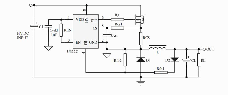 U322C是一款高性能低成本PWM控制功率器,適用于離線式小功率降壓型應用場合,外圍電路簡單、器件個數少。同時產品內置高耐壓MOSFET可提高系統浪涌耐受能力。與傳統的PWM控制器不同,U322C內部無固定時鐘驅動MOSFET,系統開關頻率隨負載(輕載、重載)變化可實現自動調節。同時芯片采用了多模式PWM控制技術,有效簡化了外圍電路設計,提升線性調整率和負載調整率并消除系統工作中的可聞噪音。此外,芯片內部峰值電流檢測閾值可跟隨實際負載情況自動調節,可以有效降低空載情況下的待機功耗。U322C集成有完備的帶自恢復功能的保護功能:VDD欠壓保護、逐周期電流限制、輸出過壓保護、過熱保護、過載保護和VDD過壓保護等。